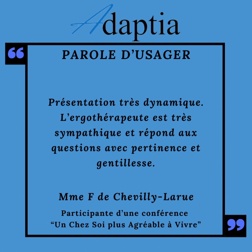 Présentation très dynamique. L’ergothérapeute est très sympathique et répond aux questions avec pertinence et gentillesse. Mme F de Chevilly-Larue, participante d’une conférence « Un Chez Soi Plus Agréable à Vivre »