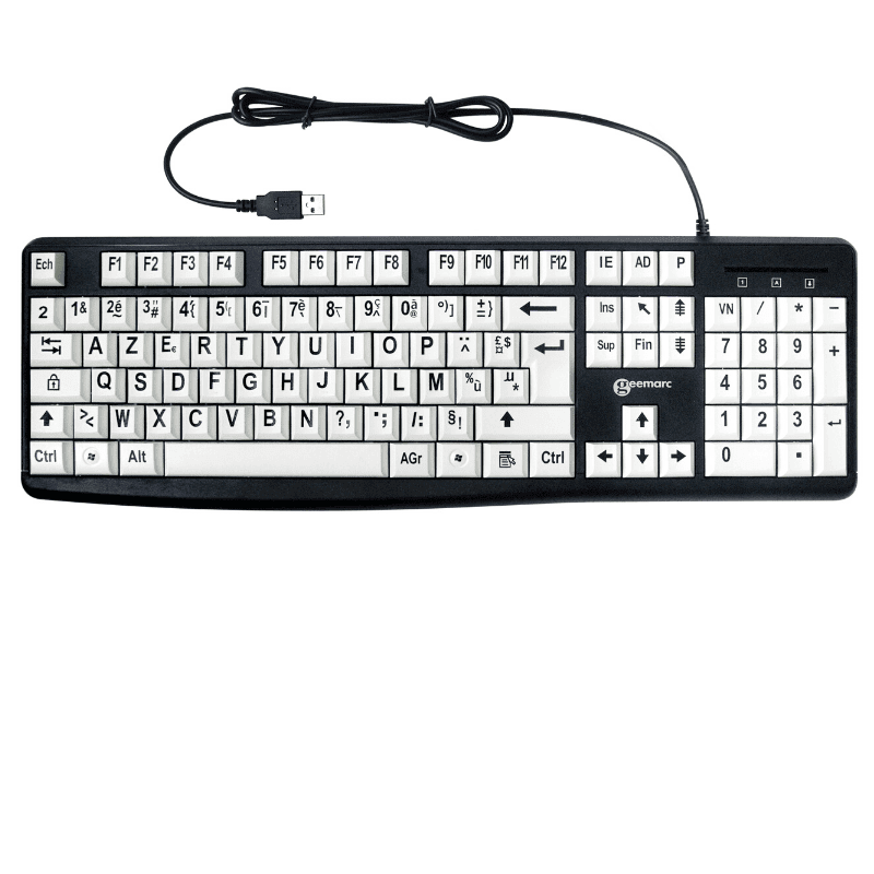 Ce clavier est équipé de touches contrastées : fond blanc, écriture noire et des caractères grossis. Ce qui va faciliter l’utilisation quotidienne du clavier. A vous d'essayer !